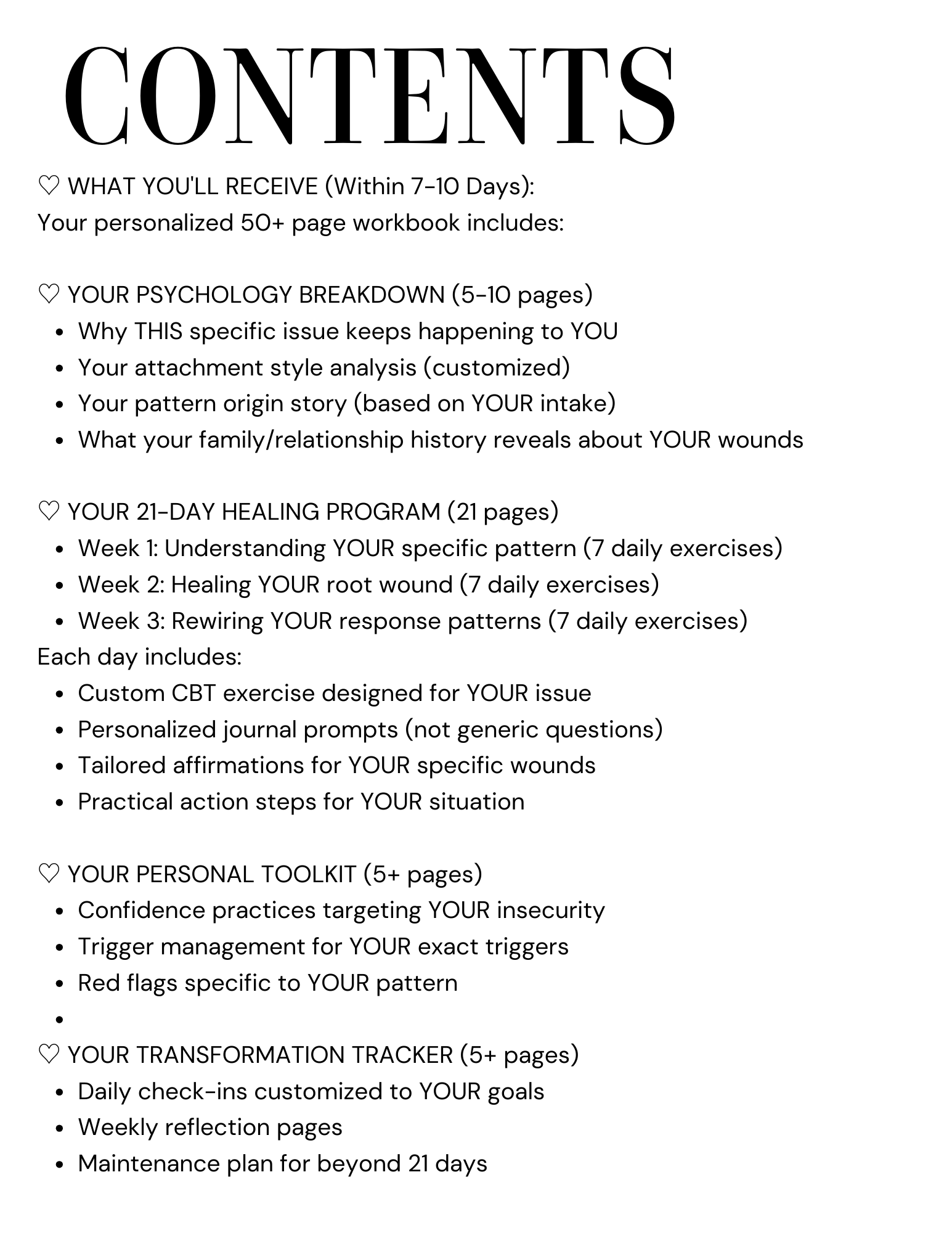 Each custom workbook is 50+ pages of focused psychology designed for YOUR specific issue. That's not a generic template - that's me personally analyzing your intake, designing custom exercises, and creating personalized content for YOUR breakthrough.